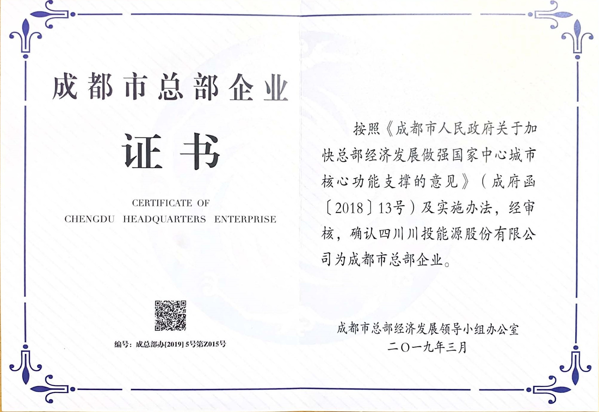 日前,從成都市總部經濟發展領導小組辦公室處傳來喜訊,經審核確認,川投能源正式通過2018年成都市第二批總部企業資質認證授牌,獲頒“成都市總部企業證書”,為2019年經營管理工作再添亮點。