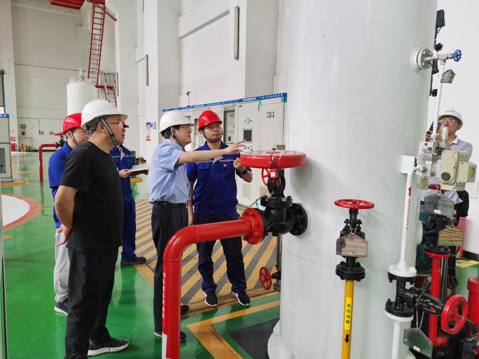楊平一行先后前往腳基坪電站大壩及發電廠區實地檢查指導,檢查組對大壩水庫調度情況、應急電源保障、防汛物資儲備、閘門啟閉設備與電站的壓力容器特種設備、發電機主設備及GIS設備進行了專項檢查。