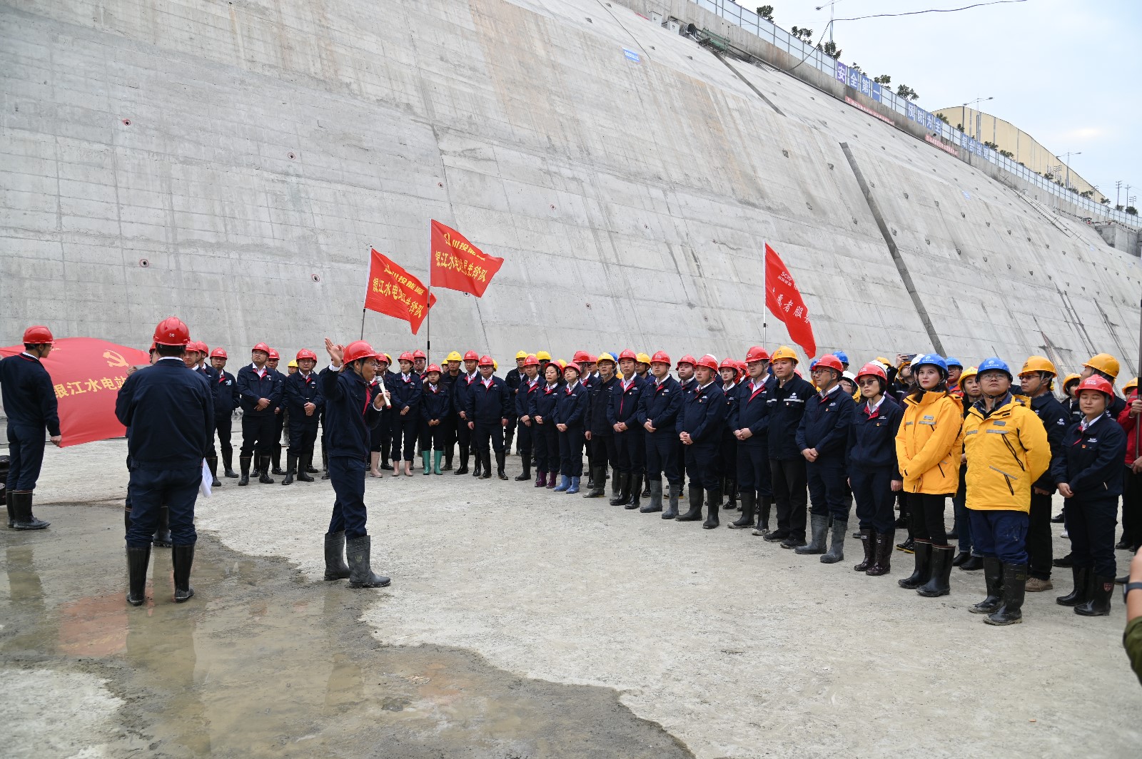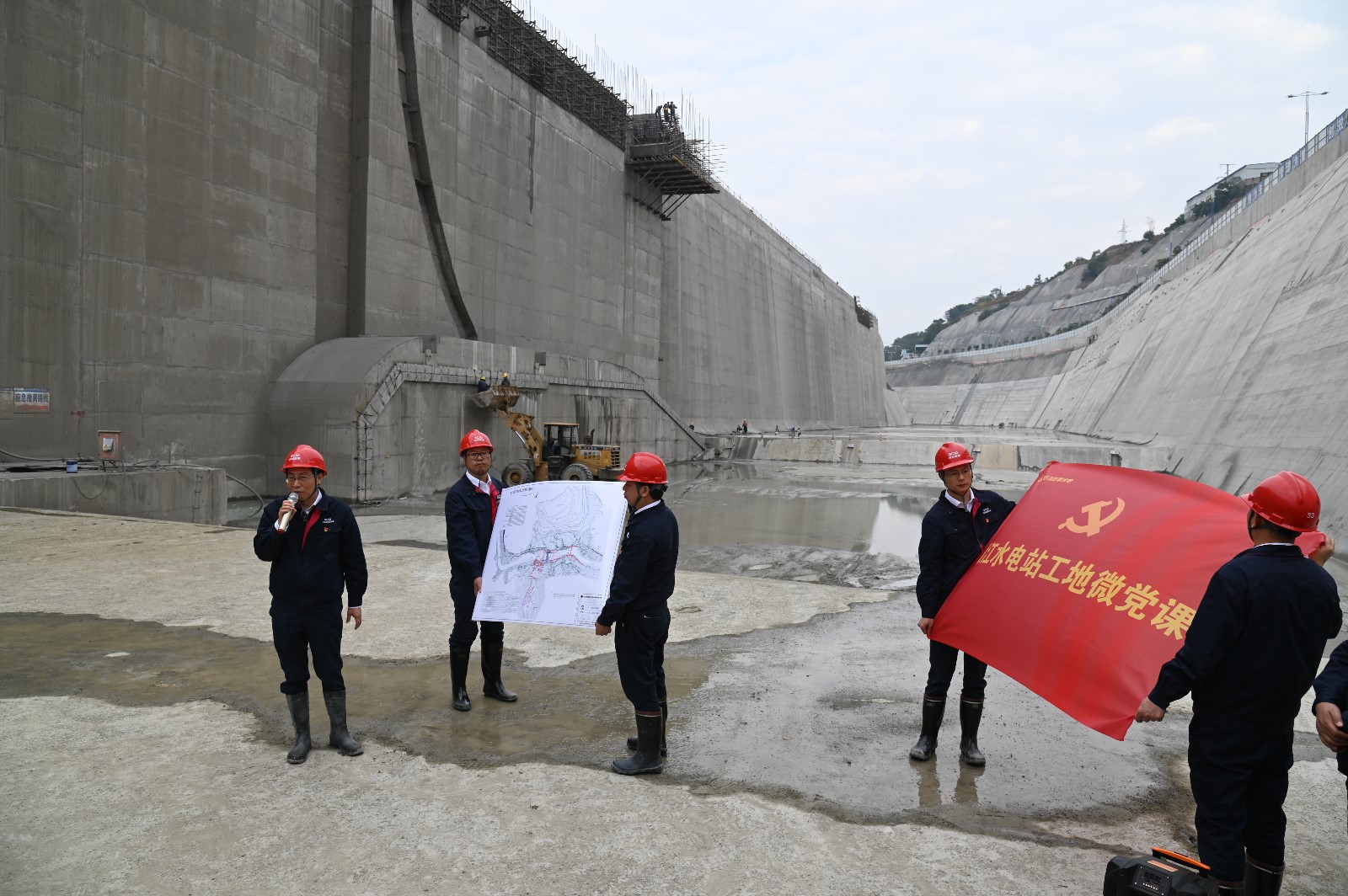 在導流明渠基坑里,徐孝剛書記為大家講授了一堂別開生面的工地微黨課。他講到,今天站在已澆筑完成的導流明渠基坑,大家都應倍感自豪,今天也是最后一次在導流明渠基坑里開展微黨課。再過兩天,我們的導流明渠就要過流了,回顧導流明渠施工的一年多時間里,我們克服了新冠疫情影響、征地拆遷滯后、邊坡地質(zhì)條件差、砂石骨料短缺等重重困難,今天的成果來之不易,靠的是全體參建單位、全體員工的共同努力,今天在這里要再向大家道一聲感謝,正是你們的艱苦付出和無私奉獻,才取得了我們今天的驕人成績。徐孝剛還對照圖紙和現(xiàn)場的施工實體,再次向大家普及了縱向圍堰、消力池、正常蓄水位、死水位等水電站施工的基礎知識,向大家講解了銀江水電站巖埂拆除、大江截流、檢修閘門和三期擋水發(fā)電等重點知識。徐孝剛強調(diào),按期保質(zhì)保量推進工程進度是我們的“初心”,把銀江水電站建設成為“精品工程、樣板工程、陽光工程”是我們的“使命”。在這最關鍵的時期,大家要再接再厲,保持緊張有序,做到萬全準備,嚴把各個關口,確保導流明渠過流和大江截流的按期順利實現(xiàn),用最優(yōu)異的成績?yōu)?021年畫上圓滿句號,為建黨百年獻上銀江賀禮。