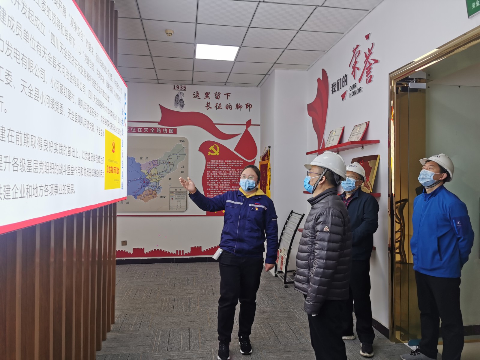 在天全河流域所屬腳基坪電廠熱火朝天的2號(hào)機(jī)組A級(jí)機(jī)組檢修現(xiàn)場(chǎng),孫前元一行聽取了腳基坪電廠自主檢修組織機(jī)構(gòu)、檢修安全管理、檢修現(xiàn)場(chǎng)施工情況等方面情況的匯報(bào);隨后,到腳基坪電廠“企地共建示范基地”黨建室進(jìn)行參觀。