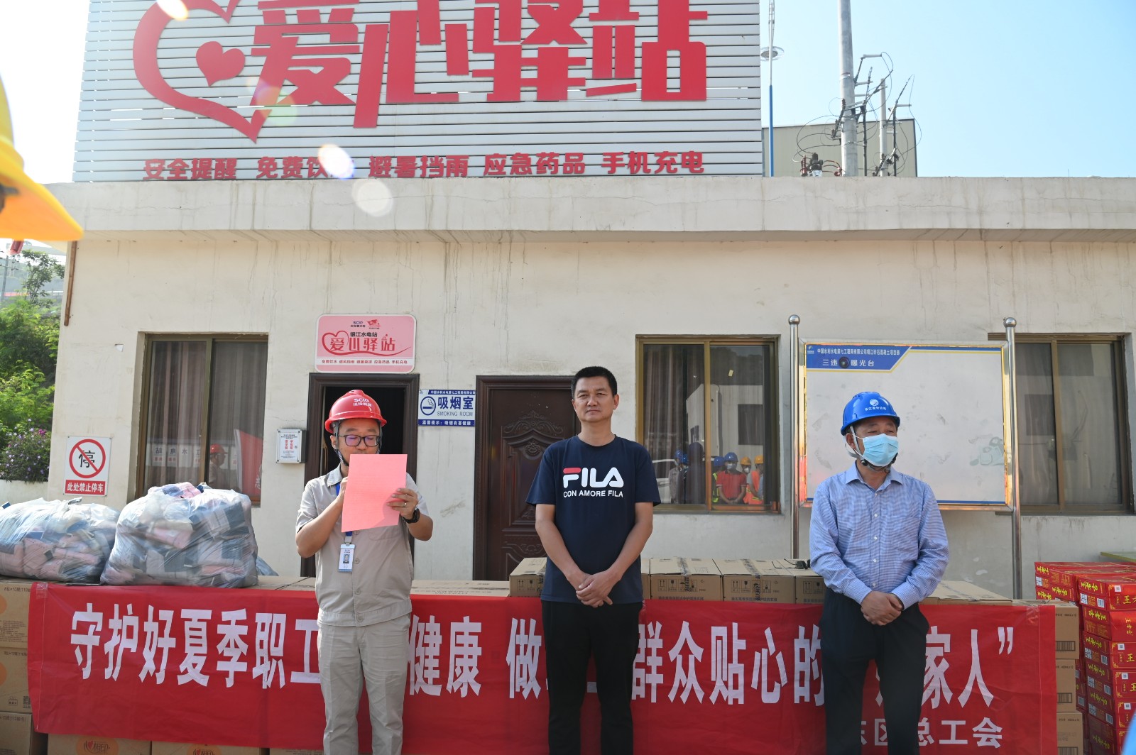雖然是上午9點,但盛夏的烈日已炙烤著銀江水電站工地。在銀江水電站“愛心驛站”,汪慶元首先致敬全體工友烈日下的“銀江精神”,高度贊揚了一線建設者三年來為銀江水電站建設做出的積極貢獻,并鼓勵他們要戰(zhàn)勝高溫酷暑等重重難關,堅守崗位完成工程建設任務。劉欣在講話中談到:東區(qū)工會心系工友,是大家的“娘家人”,希望大家保重身體,平安度夏,在落實安全防護的前提下積極工作,保質保量推進項目施工,為攀枝花的經濟建設做出更大的貢獻。