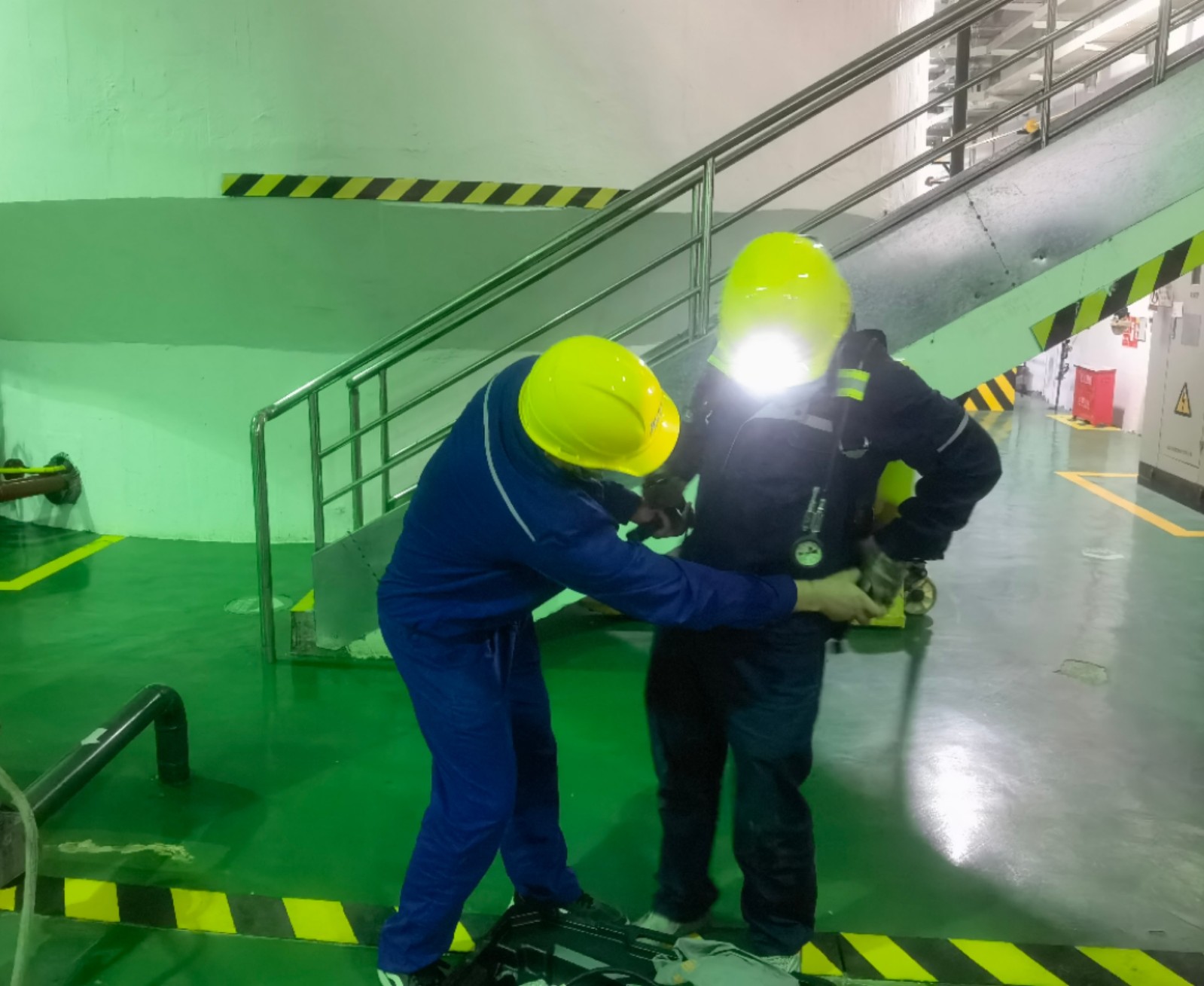 隨著總指揮一聲令下,演練正式開始?!耙幻麊T工突然暈倒,情況不明”,接到指令后,總指揮立即啟動有限空間作業(yè)現場應急處置方案,各演練小組攜帶救援設備迅速到位,穿戴變壓式呼吸機進入集水井將傷員救出,“傷員無外傷、無呼吸、無心跳”救援組對傷員情況作出基本判斷后立即實施心肺復蘇急救,用擔架轉移傷員至安全地帶,在119、120到達事故現場后,傷者移交120。各演練小組協同119對事故現場進行后續(xù)檢查,無次生風險。