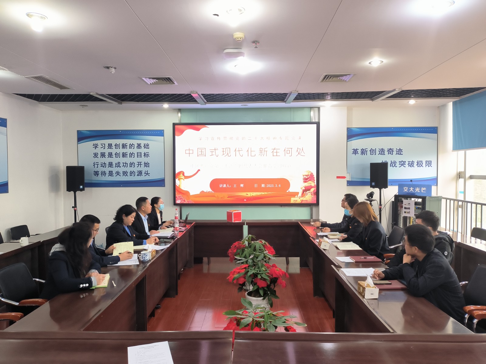 3月6日,為全面深入學(xué)習(xí)領(lǐng)會(huì)貫徹落實(shí)黨的二十大精神,打牢開好組織生活會(huì)的思想基礎(chǔ),交大光芒第一黨支部召開黨員大會(huì),集中學(xué)習(xí)習(xí)近平同志在學(xué)習(xí)貫徹黨的二十大精神研討班開班式上發(fā)表重要講話、中國共產(chǎn)黨第二十屆中央委員會(huì)第二次全體會(huì)議公報(bào)。第一支部書記、公司副總工程師兼研發(fā)中心副總經(jīng)理王輝以《中國式現(xiàn)代化新在何處》為題進(jìn)行專題黨課。