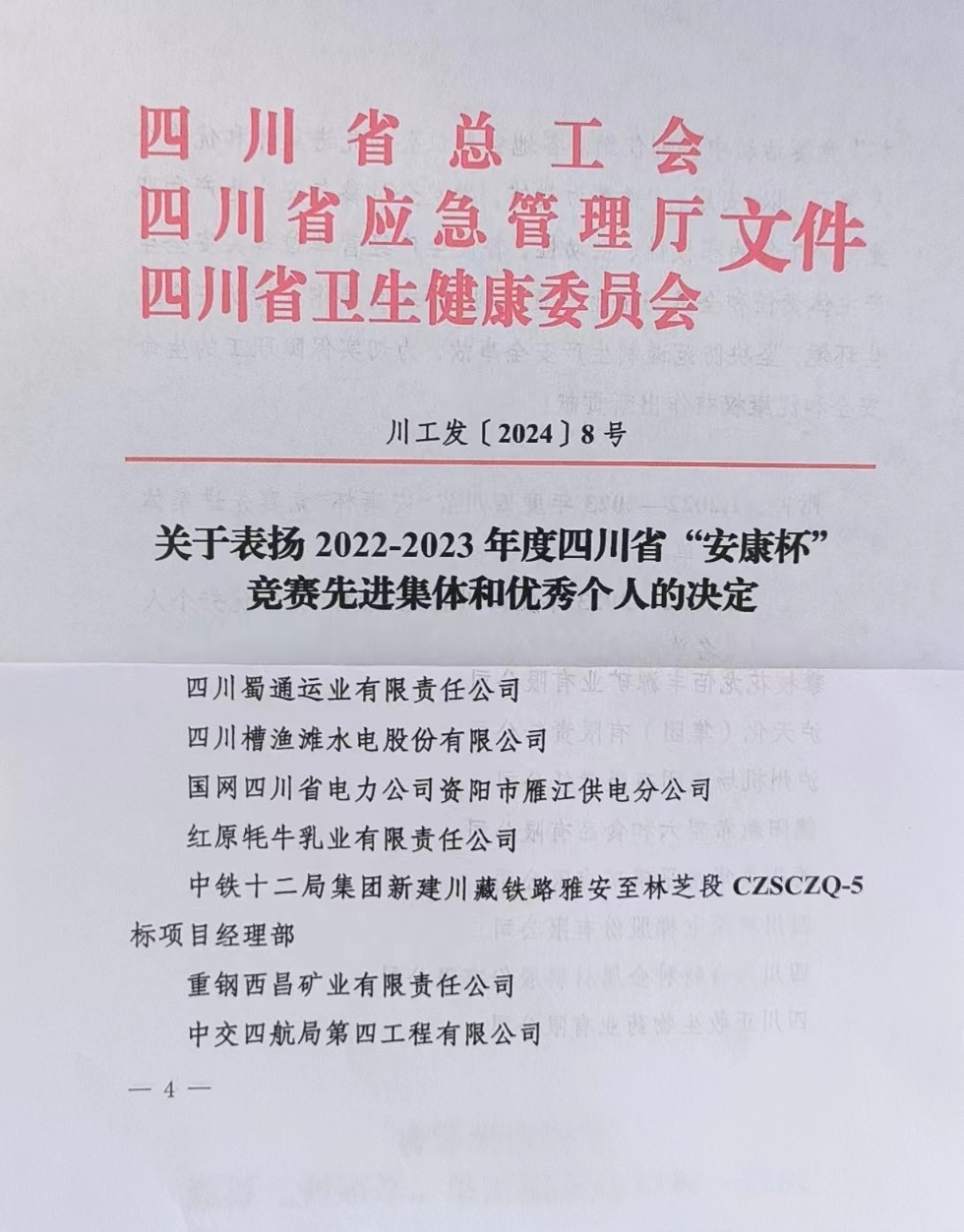 近日,四川省總工會(huì)、四川省應(yīng)急管理廳、四川省衛(wèi)生健康委員會(huì)聯(lián)合印發(fā)《關(guān)于表彰2022-2023年度四川省“安康杯”競(jìng)賽先進(jìn)集體和優(yōu)秀個(gè)人的決定》,四川槽漁灘水電股份有限公司(簡(jiǎn)稱“槽漁灘公司”)榮獲四川省“安康杯”競(jìng)賽優(yōu)勝單位榮譽(yù)稱號(hào)。