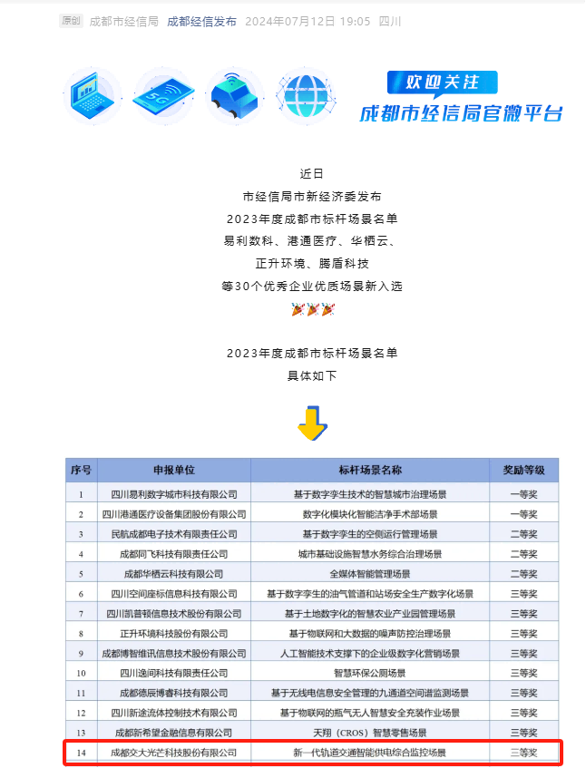 近日,成都市經(jīng)信局市新經(jīng)濟(jì)委發(fā)布2023年度成都市標(biāo)桿場景名單,交大光芒新一代軌道交通智能供電綜合監(jiān)控場景榮獲三等獎(jiǎng)。