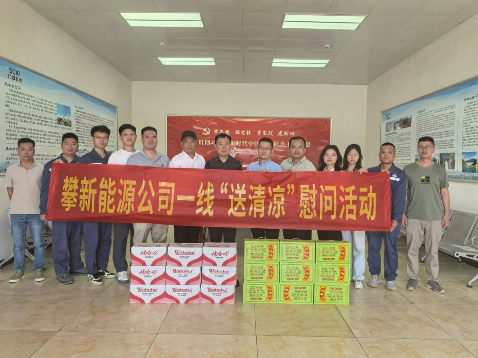 炎夏送清涼,溫情暖人心。攀新能源公司為進(jìn)一步做好防暑降溫工作,深切關(guān)懷在項(xiàng)目現(xiàn)場(chǎng)作業(yè)的一線職工職業(yè)健康,確保現(xiàn)場(chǎng)安全生產(chǎn),組織開展了“送清涼”一線慰問活動(dòng)。攀新能源公司黨支部委員、總經(jīng)理周軍帶隊(duì)“送清涼”慰問小組,依次前往廣西農(nóng)光公司、桂平光伏電站、廣西融安公司光伏發(fā)電站項(xiàng)目現(xiàn)場(chǎng),為辛勤工作的勞動(dòng)者們送去清涼與關(guān)懷。