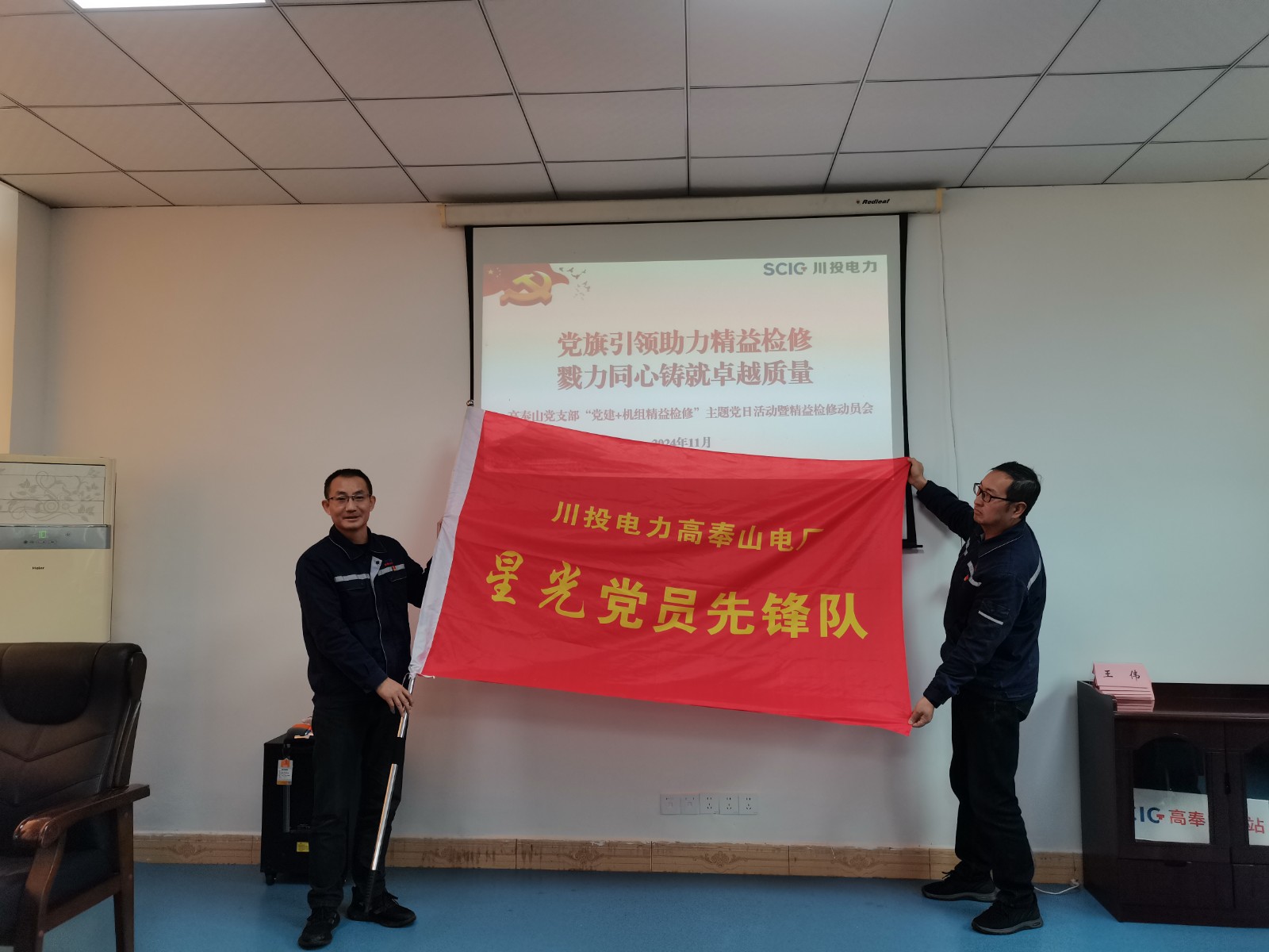 圍繞機(jī)組定期檢修及技術(shù)改造等重點(diǎn)工作任務(wù),高奉山黨支部精心策劃,構(gòu)建“1+2+3+4”專項(xiàng)活動(dòng)。即圍繞檢修工作召開(kāi)1次主題黨日活動(dòng);設(shè)置2個(gè)黨員創(chuàng)精品檢修項(xiàng)目——“發(fā)電機(jī)定子線圈、鐵芯測(cè)溫電阻技改”“發(fā)電機(jī)出口銅排技改”;成立3個(gè)攻堅(jiān)引領(lǐng)團(tuán)隊(duì)——星光黨員先鋒隊(duì)、星光黨員攻堅(jiān)隊(duì)、星光青年服務(wù)隊(duì);建立4個(gè)檢修質(zhì)量責(zé)任區(qū)——發(fā)電機(jī)區(qū)、水輪機(jī)區(qū)、電氣區(qū)、轉(zhuǎn)輪區(qū)。王橋分別為3支攻堅(jiān)引領(lǐng)團(tuán)隊(duì)授旗,4位檢修質(zhì)量責(zé)任區(qū)責(zé)任人承諾,認(rèn)真履行“責(zé)任在我肩上、質(zhì)量在我手中”的莊嚴(yán)承諾。