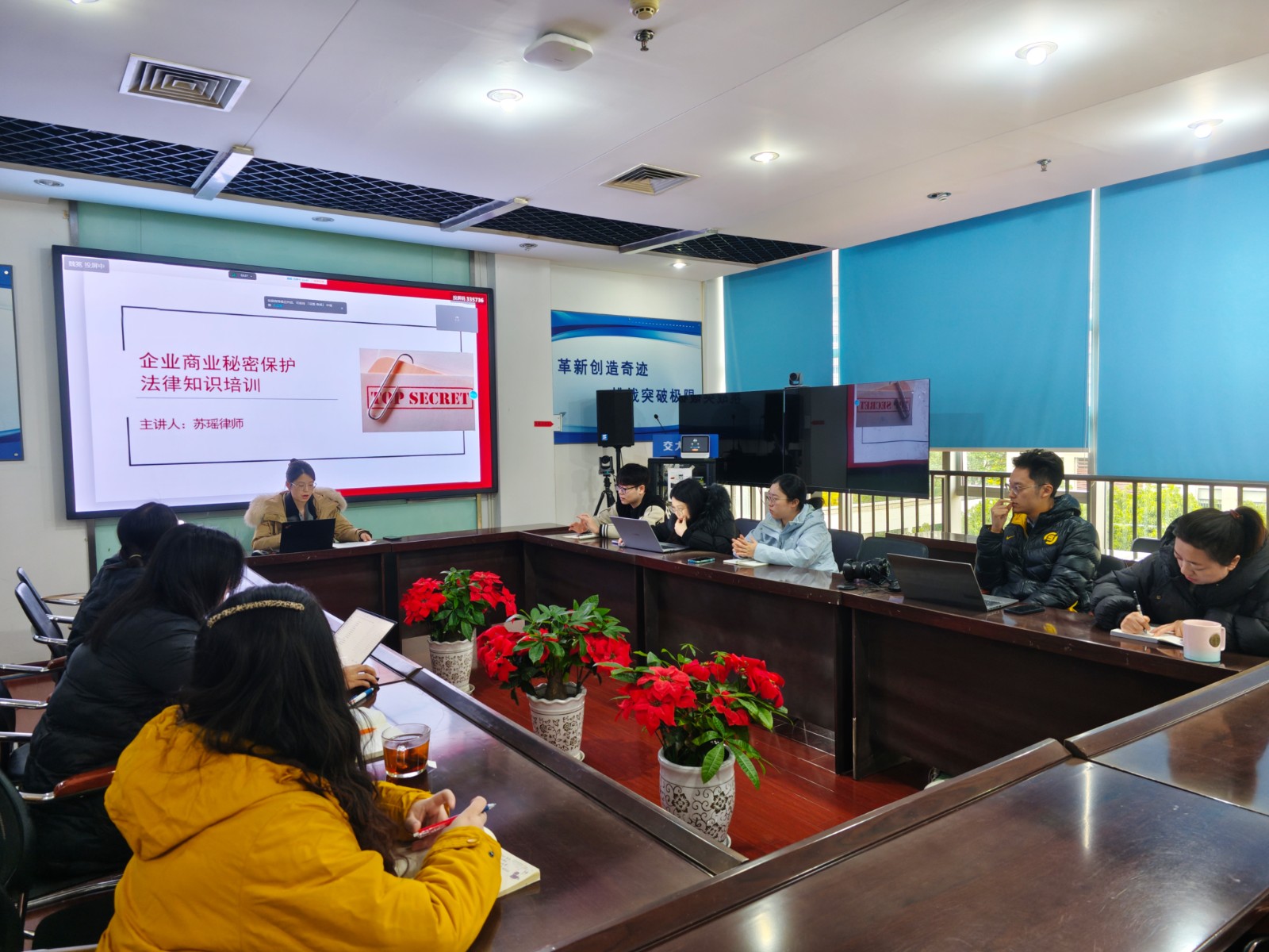 本次培訓(xùn)邀請公司常年法律顧問律師蘇瑤主講,她首先解讀憲法基本精神和特征,著重強(qiáng)調(diào)了民主、法治、人權(quán)三大核心價值,以及在推動國家治理體系和治理能力現(xiàn)代化方面的重要作用。在商業(yè)秘密保護(hù)方面,律師從定義、范圍、保護(hù)措施等入手,緊密結(jié)合企業(yè)管理實(shí)際特點(diǎn),通過案例分析商業(yè)秘密泄露的常見途徑和后果,詳細(xì)介紹了如何建立完善商業(yè)秘密保護(hù)體系。在信息安全方面,律師結(jié)合《中華人民共和國網(wǎng)絡(luò)安全法》《中華人民共和國個人信息保護(hù)法》等法律法規(guī),從個人信息安全防護(hù)意識培養(yǎng)、辦公環(huán)境中信息安全實(shí)踐、網(wǎng)絡(luò)攻擊防范與應(yīng)急響應(yīng)策略、法律法規(guī)遵循與合規(guī)性要求進(jìn)行解析,對如何提高公司信息安全能力提出專業(yè)意見。
