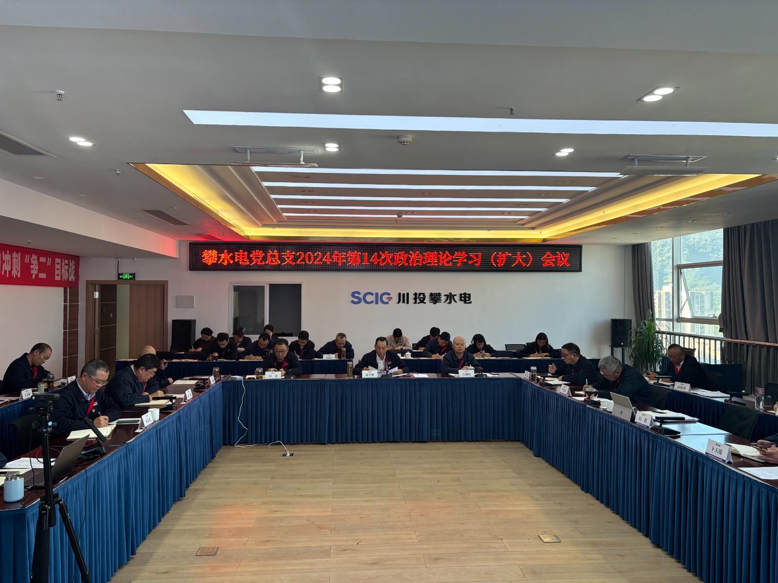 為深入貫徹落實習近平總書記近期重要講話精神,樹牢安全環保和廉潔從業精神,近日,攀水電黨總支在公司2620會議室召開了2024年第14次政治理論學習(擴大)會議,學習第一議題、上級會議、文件、安全環保、廉政警示教育等相關內容。川投能源副總經理、攀水電公司黨總支書記、董事長徐孝剛主持會議,攀水電公司黨員干部、統戰對象、入黨積極分子共30余人參加學習。