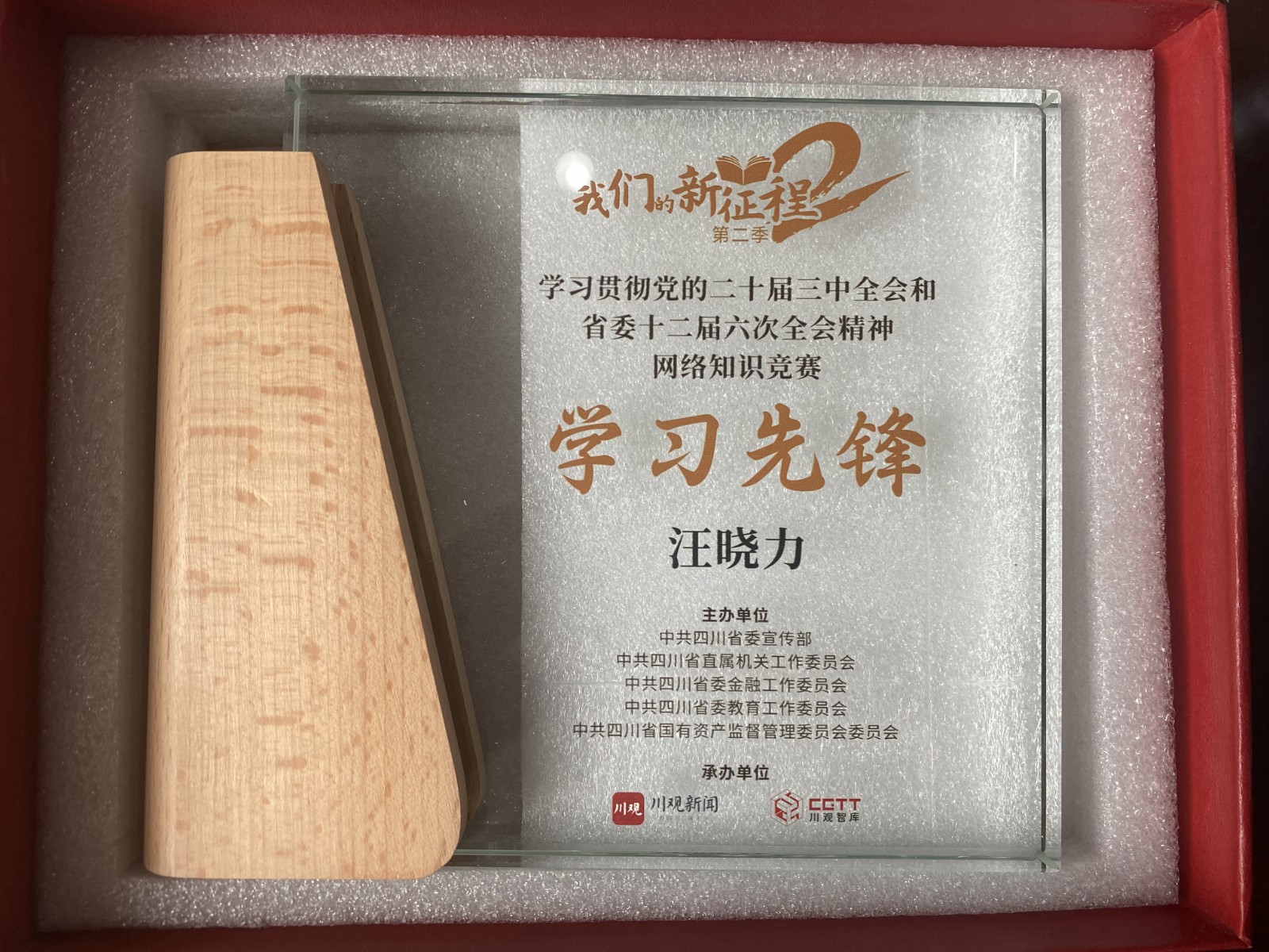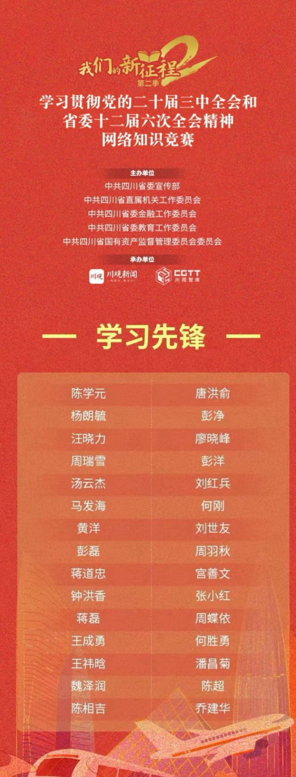 近日,由中共四川省委宣傳部、省委省直機關(guān)工委、省委金融工委、省委教育工委、省國資委黨委聯(lián)合主辦,四川日報報業(yè)集團承辦的“我們的新征程”(第二季)網(wǎng)絡(luò)知識競賽公布了獲獎名單,并為獲獎人員發(fā)放獎牌,川投電力所屬天彭電力11名員工憑借扎實的理論功底和鍥而不舍的努力,從全省32萬余名參與競賽的黨員群眾中脫穎而出,進入全省個人排行榜前30名,榮獲“學習先鋒”稱號。
