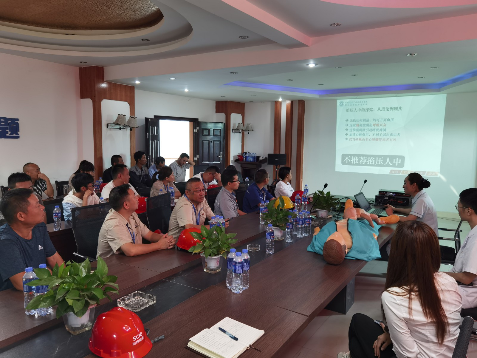 本次培訓(xùn)內(nèi)容包括心肺復(fù)蘇搶救、現(xiàn)場處置急救兩部分。培訓(xùn)老師首先對心肺復(fù)蘇被搶救人員的表現(xiàn)癥狀、搶救過程、注意事項等理論知識進行了詳細(xì)的講解;其次結(jié)合日常生活和工程建設(shè)過程中可能發(fā)生的呼吸道異物堵塞、外傷現(xiàn)場止血和包扎、燙傷、犬傷(狂犬病)等現(xiàn)場搶救理論知識進行了詳細(xì)講解。理論知識講解結(jié)束后,培訓(xùn)老師以學(xué)員為模特進行了外傷包扎操作演示;由學(xué)員利用教學(xué)模型逐一進行了心肺復(fù)蘇實際操作練習(xí),培訓(xùn)老師全程進行耐心的糾正和指導(dǎo),直至學(xué)員操作合格。