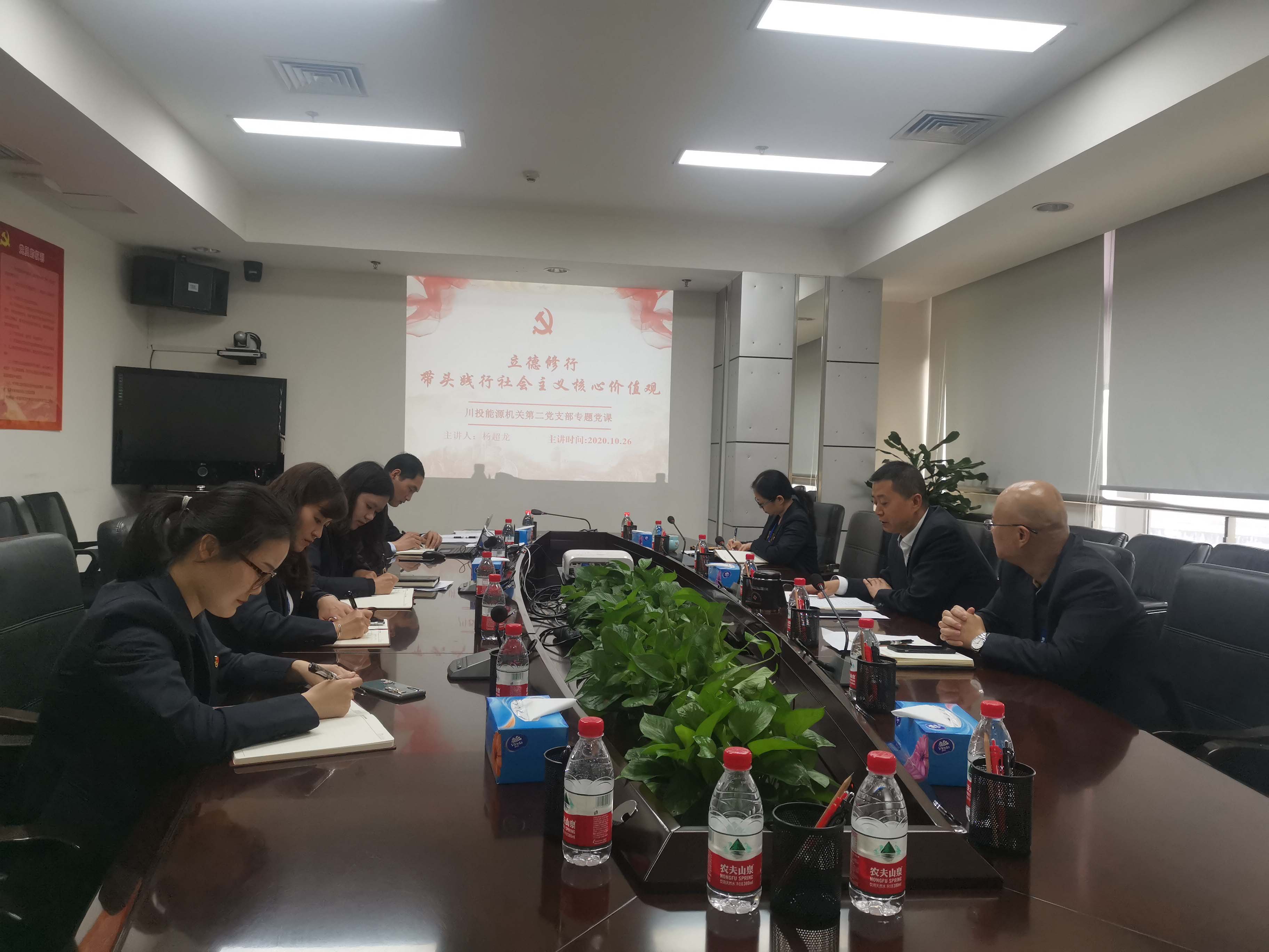 10月26日,川投能源機關第二黨支部召開黨員大會,公司黨委副書記、工會主席楊超龍以《立德修行,帶頭踐行社會主義核心價值觀》為題,就社會主義核心價值觀的內容、重要意義以及黨員干部如何踐行三個方面,結合理論與自身感悟,深入淺出地為二支部黨員講授了一堂精彩的黨課。