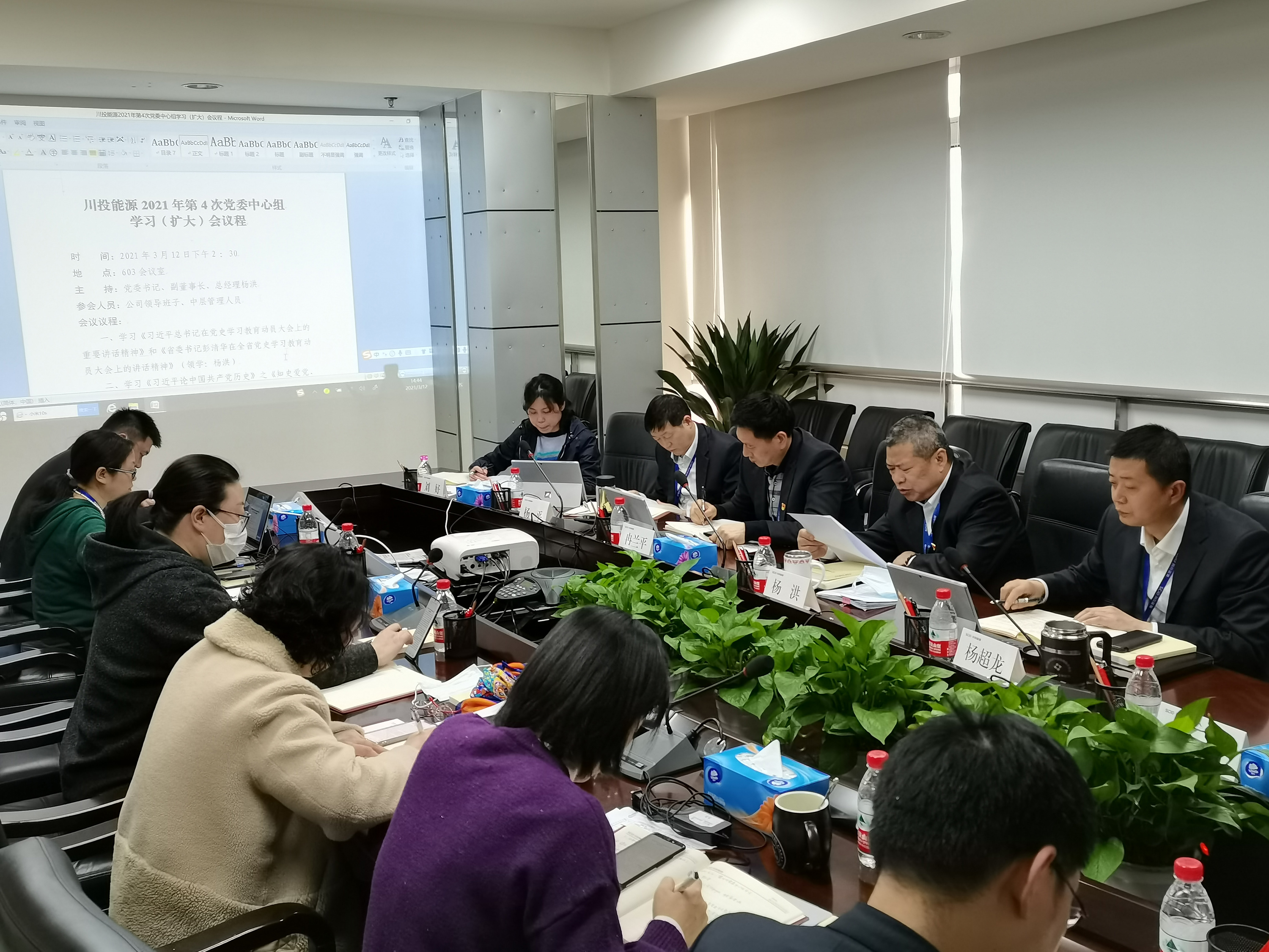 3月12日,川投能源召開黨委理論學習中心組學習(擴大)會議,傳達習近平總書記在黨史學習教育動員大會上的重要講話精神和省委書記彭清華在全省黨史學習教育動員大會上的講話精神,并集中學習《習近平論中國共產黨歷史》之《知史愛黨、知史愛國》篇章。公司黨委書記、副董事長、總經理楊洪主持會議并帶頭領學。公司領導班子成員、各部門負責人參加學習。